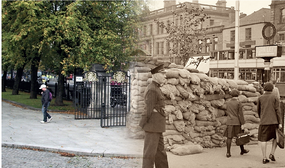 A lone R.U.C. (Royal Ulster Constabulary) constable is on duty at the front gates of Belfast City Hall (Donegall Square North) on 4th September 1938 and the caption helpfully describes ‘Building air raid shelters during the crisis’. The crisis was the build-up of hostilities in Europe by Germany who had annexed Austria (The Anschluss) in March 1938 and preparations were underway in Belfast during the prelude to the Second World War. An interesting local press report in August 1939 by Sir Kingsley Wood, Secretary of State for Air, during a visit to Belfast quoted him as saying that he thought ‘war was not inevitable’.