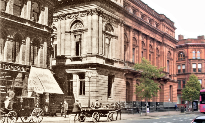 The name of Shaftesbury Square was first recorded in 1887. It is a major road junction and meeting place of Great Victoria Street, Dublin Road, Donegall Pass, Botanic Avenue, Bradbury Place and Donegall Road. It is named after the 8th Earl of Shaftesbury, who in 1857 married Harriet Chichester the only daughter of the 3d Marquis of Donegall. The route from Great Victoria Street to University Road has been dubbed the ‘Golden Mile’ and is well-known today for hotels, hospitality venues and eateries. However, in Victorian times there were many residents from the medical profession, plus at least one hospital and may have been accurately referred to as ‘the valley of the shadow of death’. In the 1910 view the building in the centre is the Magdalene Parochial Hall of St. Mary Magdalene, Church of Ireland in neighbouring Donegall Pass. It was opened in 1853 as a ‘Sunday & Day School’ but closed and demolished as traffic volumes increased. The site had been occupied by a large bank building since 1960 but it recently closed.