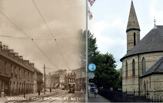 St Patrick is said to have passed this way in 455 A.D. on his travels, probably following the route of the neighbouring River Farset. St Matthew’s Church of Ireland is the parish church of Shankill, Gaelic: Seanchill, ‘Old church’ and situated where Shankill Road meets Woodvale Road on the corner of Cambrai Street. The church building was described as ‘a wholly astonishing church’, when consecrated in 1872. Its style has been described as ‘Byzantine’ and in addition to the Irish round tower the building contains four Corinthian columns to support the roof. It replaced the ‘Old St Matthew’s Church’ which was built in 1839 on the site of the existing Parochial Hall, beside Shankill Graveyard and alongside the River Farset. In those days there was only one house on Shankill Road between St Matthew’s and Peter’s Hill. The Campbell family all attended St Matthew’s during the 1960s when my father Rev. Canon A.J.E. Campbell was Rector here.