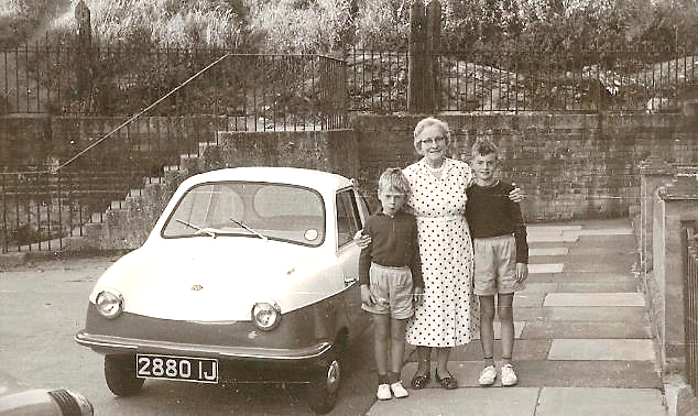 Minnie Gray is outside her home at 37 Moorfield Street with grandsons Eric and Mike in the late 1950s. The wall in the background is the embankment of the Belfast & County Down Railway. The small car is a Nobel 200 owned by son Jack Gray. It had a 200cc motorcycle engine (one is on display at Ulster Folk & Transport Museum, Cultra) and a fibre-glass body and was constructed locally under licence by Shorts Aircraft, first at their Newtownards site and then Queen’s Island site. One of the key figures in bringing the project here in the 1950s was Cyril Lord, well-known as a carpet manufacturer. Unusually the Nobel had no reverse gear and required engine reversing.