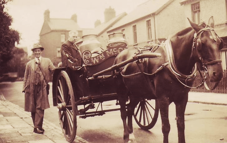 Billy McCrea lived at Sandown Road near Ballyhackamore and delivered buttermilk to houses in East Belfast for many years. Here is a smiling Billy with his fine horse (Jimmy) and cart with churns (milk was not delivered by bottle or carton in those days) at Clonlee Drive in June 1932. The tall house in the distance is situated at 194 Upper Newtownards Road.