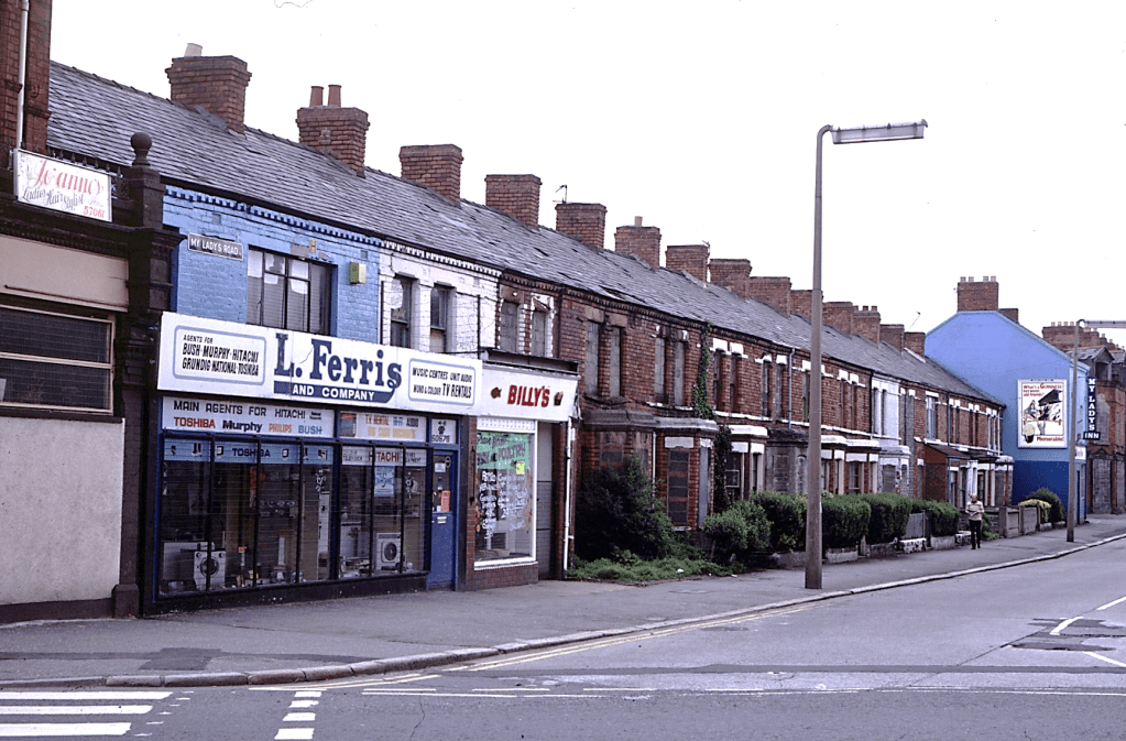 The electrical store premises of L. Ferris and Company were located at 4-6 My Lady’s Road in this 1981 view. At the far end of the terrace at 34 My Lady’s Road (since demolished), next to My Lady’s Inn, was the home of the parents of the business owner Lennie Ferris. Jim Lendrum spent 46 years of his working life at Ferris’s from the 1950s and witnessed great changes in the development of television.