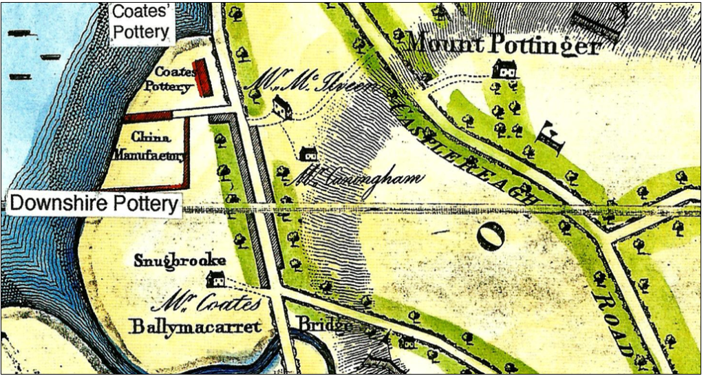A look at Lagan Village in 1791 from John Williamson’s Map. Some of the earliest industries at Ballymacarrett were the Downshire Pottery (plus a glasshouse see Ballymacarrett p.25) established by Thomas Greg who was described as ‘probably the wealthiest merchant of his day’. In 1787 he produced fine ceramic pottery creamwares such as cups, saucers, plates and jugs. Downshire Pottery remained in business until 1806. The business was set up in competition with ‘the greatest creamware potter of them all’ Josiah Wedgewood. Next door was Victor Coates’s Pottery making garden pots, tiles and chimney-pots. Nearby was his home ‘Snugbrooke’.