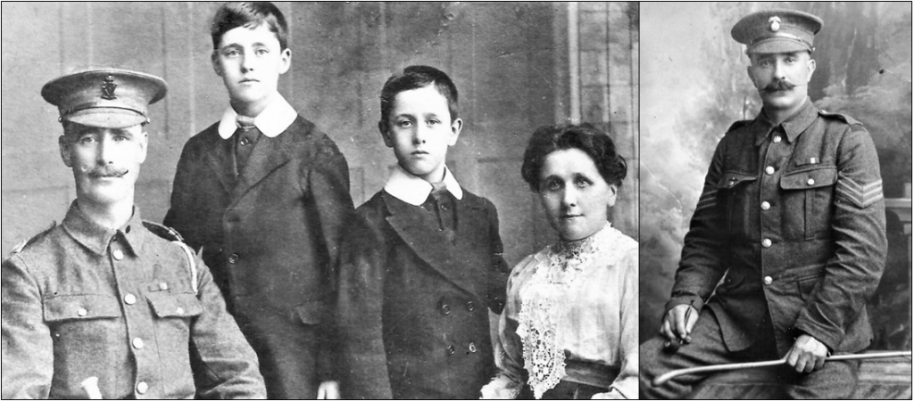 Company Sergeant Major Stewart Morrow is pictured (left) in 1914 with his wife Sarah (nee Dunlop) and sons Stewart (Jnr) and Thomas. The family home was at 19 Rathmore Street. Stewart died from wounds sustained on 1st July 1916 at the Battle of the Somme and was buried at Dundonald Cemetery. He had been a very popular military instructor at the Willowfield Battalion and his coffin was conveyed on a gun carriage and accompanied by a large cortege. The funeral service was carried out by the Rector of Willowfield Parish Church, Canon Charles William Harding (see Cregagh p.41). Sgt Samuel Kelly (right), Royal Inniskilling Fusiliers, was awarded the Distinguished Conduct Medal (DCM) ‘for conspicuous gallantry during operations’. He was a son of William Kelly, a compositor, from 9 Madrid Street and also a member of the Willowfield Battalion. He later married Isabella Ranson of 53 Ravenhill Road.
